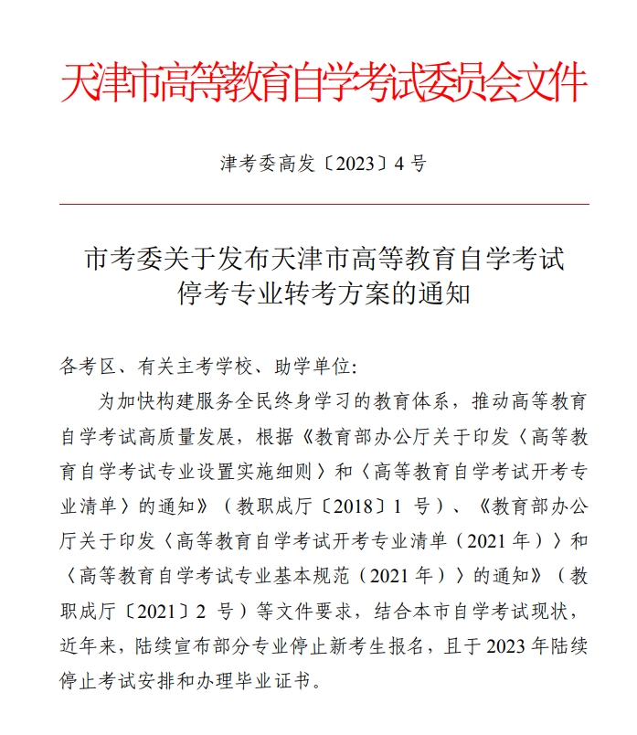 市考委关于发布天津市高等教育自学考试停考专业转考方案的通知