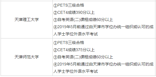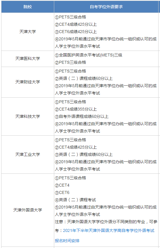 天津自考各院校学士学位申请外语要求表